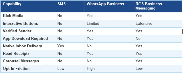 The critical differentiator is straightforward: RCS delivers WhatsApp-level richness through the native SMS inbox with no app installation required. For enterprises targeting broad consumer audiences, particularly in markets where WhatsApp penetration is uneven or where iOS adoption is high, RCS offers meaningful incremental reach.