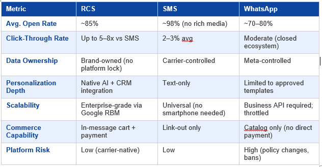 The critical differentiator is data sovereignty. WhatsApp gives Meta visibility into your customer engagement patterns. SMS data lives in carrier logs you don't control. RCS conversations when routed through your own platform and generate first-party behavioral data that you own, enrich, and act on. In an era where customer data strategy is a boardroom conversation, this is not a minor footnote.